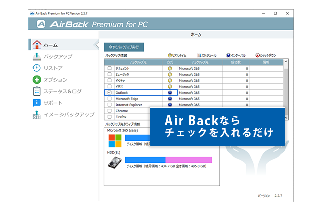 Air Back Premium for PC であれば、 Microsoft Outlook を閉じずにバックアップすることが可能です。